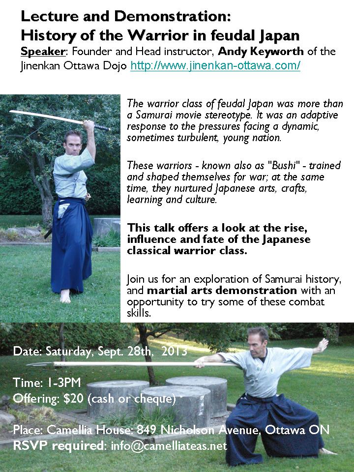 At the gracious invitation of Camellia Teas, Dojo-Cho Andy Keyworth will deliver a history lecture on the "History of the Warrior in Feudal Japan". A demonstration of some of the martial arts made famous by the warrior class will follow in the garden (with modification possibly necessary due to weather). Camellia Teas is a beautiful setting for an exploration of this aspect of Japanese history.